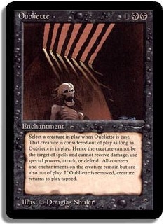 elect a creature in play when Oubliette is cast. That creature is considered out of play as long as Oubliette is in play. Hence the creature cannot be the target of spells and cannot receive damage, use special powers, attack, or defend. All counters and enchantments on the creature remain but are also out of play. If Oubliette is removed, creature returns to play tapped.