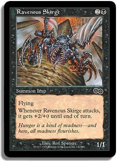Flying. Whenever Ravenous Skirge attacks, it gets +2/+0 until end of turn.
