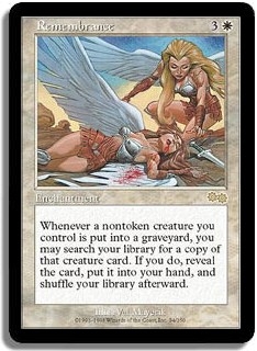 Whenever a nontoken creature you control is put into a graveyard, you may search your library for a copy of that creature card. If you do, reveal the card, put it into your hand, and shuffle your library afterward.