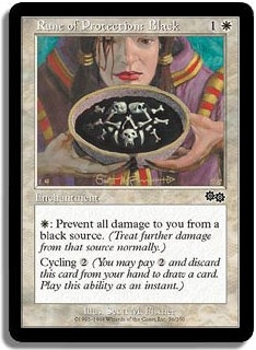 <W>: Prevent all damage to you from a black source. (Treat further damage from that source normally.) Cycling <2>.