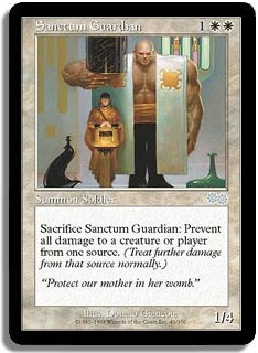 <Sacrifice Sanctum Guardian>: Prevent all damage to a creature or player from one source. (Treat further damage from that source normally.)
