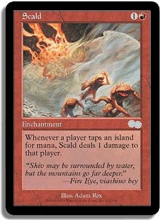 Whenever a player taps an island for mana, Scald deals 1 damage to that player.