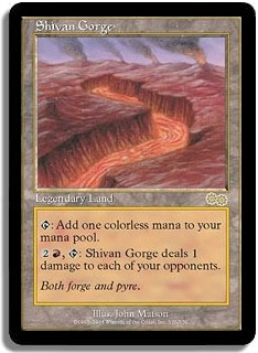<T>: Add one colorless mana to your mana pool. <2R,T>: Shivan Gorge deals 1 damage to each of your opponents.