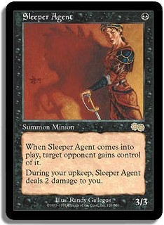 When Sleeper Agent comes into play, target opponent gains control of it. During your upkeep, Sleeper Agent deals 2 damage to you.