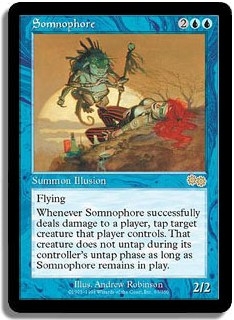 Flying. Whenever Somnophore successfully deals damage to a player, tap target creature that player controls. That creature does not untap during its controller's untap phase as long as Somnophore remains in play.