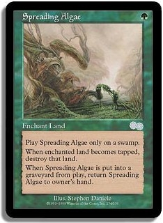 Play Spreading Algae only on a swamp. When enchanted land becomes tapped, destroy that land. When Spreading Algae is put into a graveyard from play, return Spreading Algae to owner's hand.