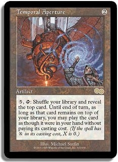 <5,T>: Shuffle your library and reveal the top card. Until end of turn, as long that card remains on top of your library, you may play that card as if it were in your hand without paying its casting cost. (If the spell has <X> in its casting cost, <X> is <0>.)
