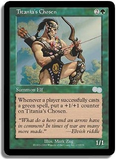 Whenever a player succesfully casts a green spell, put a +1/+1 counter on Titania's Chosen.