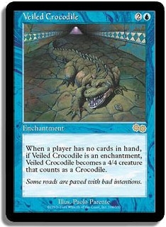 When a player has no cards in hand, if Veiled Crocodile is an enchantment, Veiled Crocodile becomes a 4/4 creature that counts as a Crocodile.