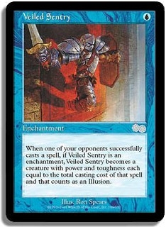 When one of your opponents successfully casts a spell, if Veiled Sentry is an enchantment, Veiled Sentry becomes a creature with power and toughness each equal to the total casting cost of that spell, and counts as an Illusion.