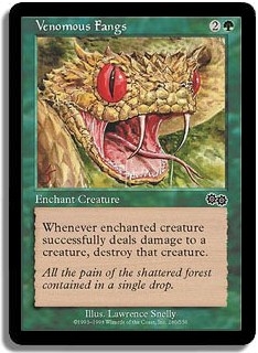 Whenever enchanted creature successfully deals damage to a creature, destroy that creature.
