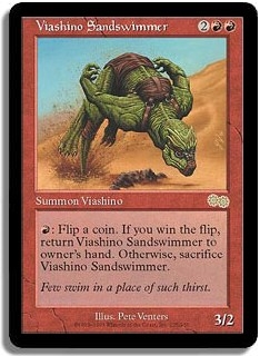 <R>: Flip a coin. If you win the flip, return Viashino Sandswimmer to owner's hand. Otherwise, sacrifice Viashino Sandswimmer.