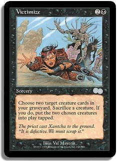 Choose two target creature cards in your graveyard. Sacrifice a creature. If you do, put the two chosen creatures into play, tapped.
