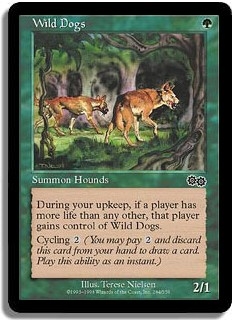 During your upkeep, if a player has more life than any other, that player gains control of Wild Dogs. Cycling <2>.