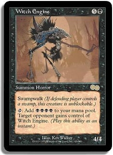 Swampwalk. <T>: Add <BBBB> to your mana pool. Target opponent gains control of Witch Engine. (Play this ability as an instant.)