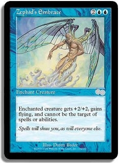 Enchanted creature gets +2/+2, gains flying, and cannot be the target of spells or abilities.