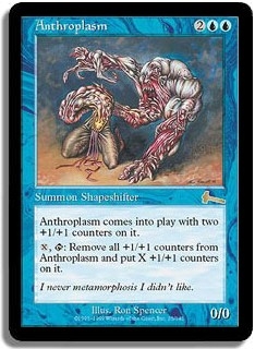 Anthroplasm comes into play with two +1/+1 counters on it.<X, T>: Remove all +1/+1 counters from Anthroplasm and put X +1/+1 counters on it.