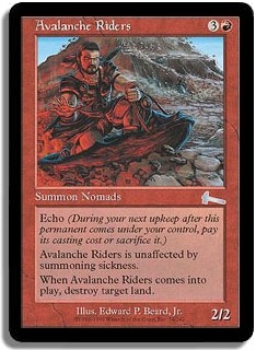 Echo. Avalanche Riders is unaffected by Smning sickness. When Avalanche Riders comes into play, destroy target land.