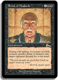 During your upkeep, if you have no cards in hand, sacrifice Brink of Madness and target opponent discards his or her hand.