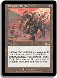 A player who controls more permanents than any other cannot play lands or artifact, creature, or enchantment spells. That player may sacrifice a permanent to ignore this effect until end of turn.