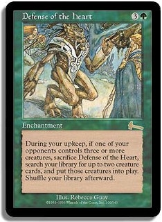 During your upkeep, if an opponent controls three or more creatures, sacrifice Defense of the Heart, search your library for up to two creature cards, and put those creatures into play. Shuffle your library afterward.
