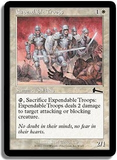 <T,Sacrifice Expendable Troops>: Expendable Troops deals 2 damage to target attacking or blocking creature.