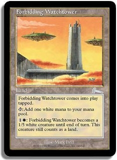 Forbidden Watchtower comes into play tapped. <T>: Add one white mana to your mana pool. <1W,T>: Forbidden Watchtower becomes a 1/5 white creature until end of turn. This creature still counts as a land.