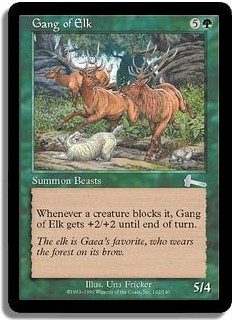 Whenever a creature blocks it, Gang of Elk gets +2/+2 until end of turn.
