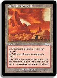 Ghitu Encampment comes into play tapped. <T>: Add one red mana to your mana pool. <1R>: Ghitu Encampment becomes a 2/1 red creature with first strike until end of turn. This creature still counts as a land.