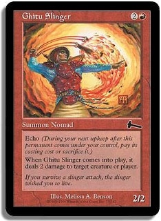 Echo. When Ghitu Slinger comes into play, it deals 2 damage to target creature or player.