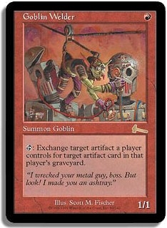 <T>: Choose a player. Exchange target artifact that player controls with target artifact in that player's graveyard.