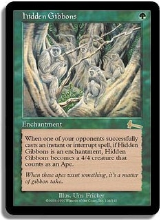 When one of your opponents successfully casts an instant or interrupt spell, if Hidden Gibbons is an enchantment, Hidden Gibbons becomes a 4/4 creature that counts as an ape.