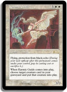 Flying, protection from black, Echo. When Karmic Guide comes into play, choose target creature card in your graveyard and put that creature into play.