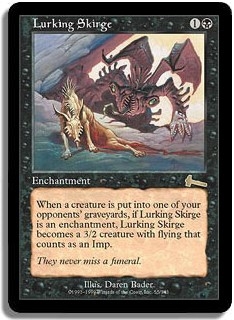 When a creature is put into one of your opponents' graveyards, if Lurking Skirge is an enchantment, Lurking Skirge becomes a 3/2 creature with flying that counts as an Imp.