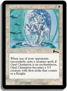 When one of your opponents successfully casts a creature spell, if Opal Champion is an enchantment, Opal Champion becomes a 3/3 creature with first strike that counts as a Knight.