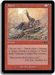 Choose one - Parch deals 2 damage to target creature or player; or Parch deals 4 damage to target blue creature.