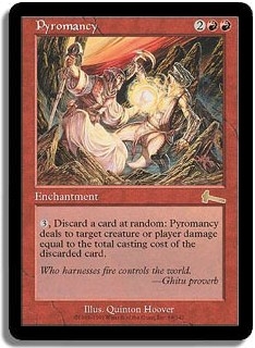 <3, Discard a card at random>: Pyromancy deals to target creature or player an amount of damage equal to the total casting cost of the discarded card.
