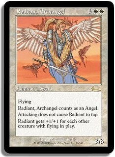 Flying Radiant, Archangel counts as an Angel. Attacking does not cause Radiant to tap. Radiant gets +1/+1 for each other creature with flying in play.