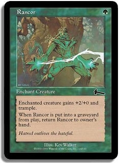 Enchanted creature gains +2/+0 and trample. When Rancor is put into a graveyard from play, return Rancor to owner's hand.