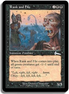 When Rank and File comes into play, all green creatures get -1/-1 until end of turn.