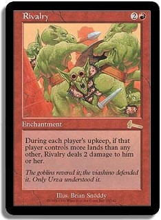 During each player's upkeep if that player controls more lands than any other player, Rivalry deals 2 damage to him or her.