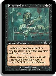 Enchanted creature cannot be blocked except by artifact creatures and black creatures. When Sleeper's Guile is put into a graveyard from play, return Sleeper's Guile to owner's hand.