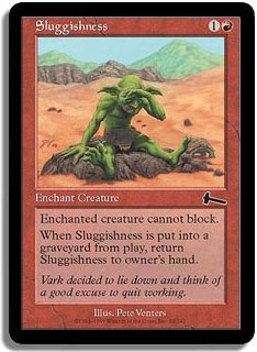 Enchanted creature cannot block. When Sluggishness is put into a graveyard from play, return Sluggishness to owner's hand.