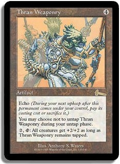 Echo. <2,T>: All creatures get +2/+2 as long as Thran Weaponry remains tapped. You may choose to not to untap Thran Weaponry during your untap phase.