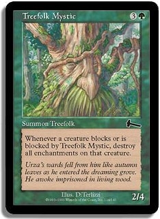 Whenever a creature blocks or is blocked by a Treefolk Mystic, destroy all enchantments on that creature.