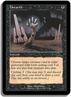 Cycling <2>. Choose target creature card in your graveyard with total casting cost <3> or less and put that creature into play.