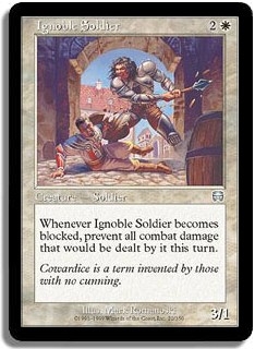 Whenever Ignoble Soldier becomes blocked prevent all combat damage that would be dealt by it this turn.