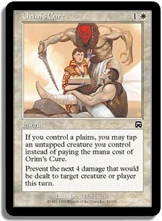 If you control a plains you may tap an untapped creature you control rather than pay the mana cost of Orim's Cure. Prevent the next 4 damage that would be dealt to target creature or player this turn.