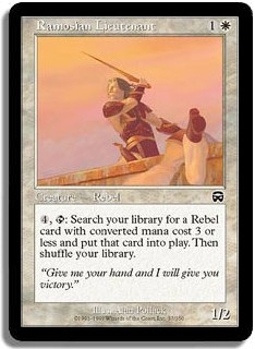 4 T: Search your library for a Rebel card with converted mana cost 3 or less and put that card into play. Then shuffle your library.