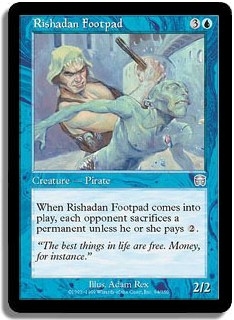 When Rishadan Footpad comes into play each opponent sacrifices a permanent unless he or she pays 2.